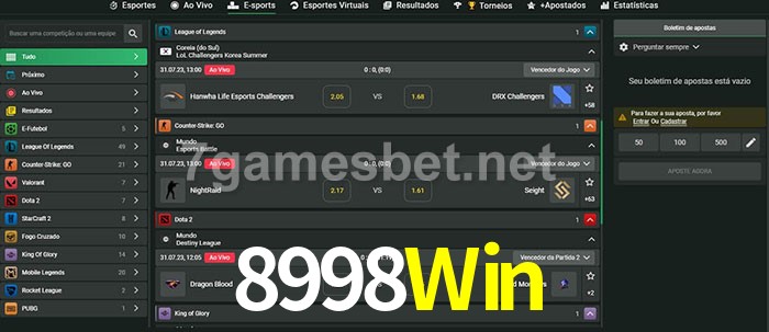 O 8998Win oferece uma grande seleção de opções de apostas em e-sports com probabilidades competitivas